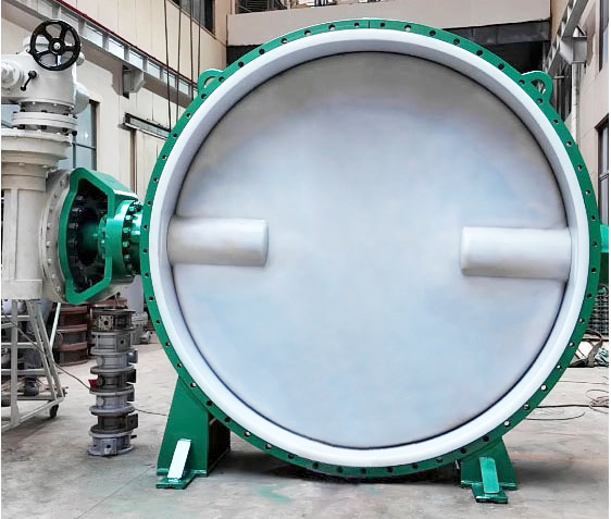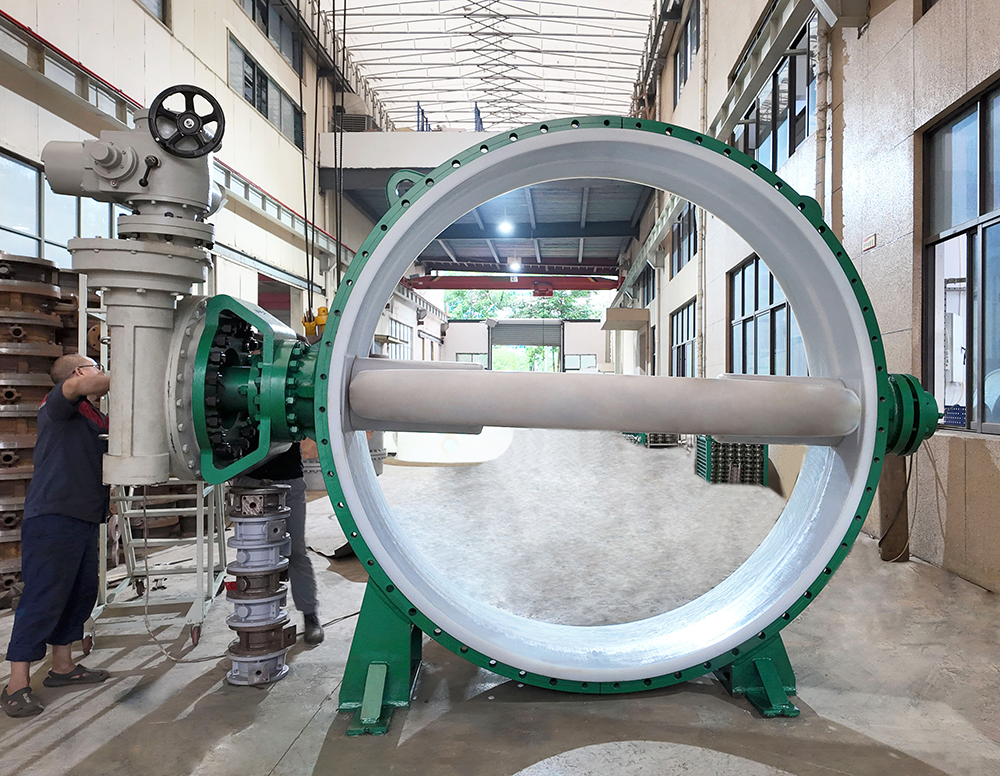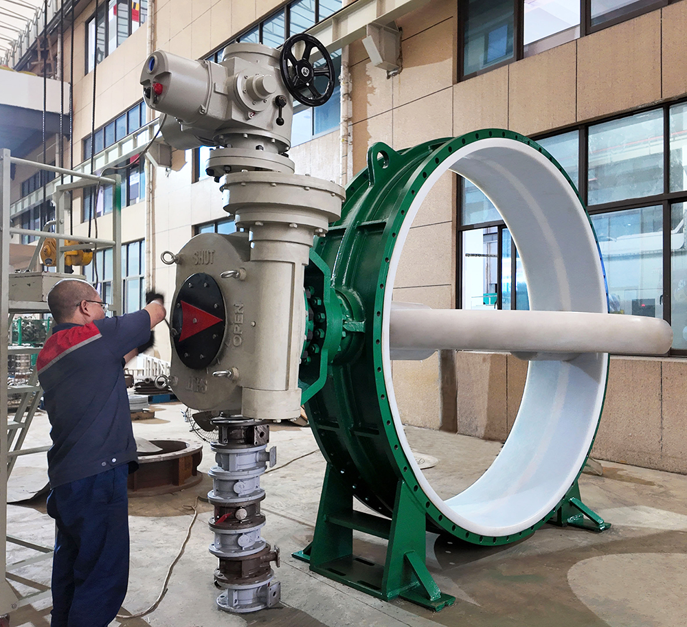 電動襯氟蝶閥是由電動執行機構和襯氟蝶閥閥體組成,電動執行器接受DCS控制信號(開關量、模擬量)可驅動襯氟蝶閥動作,實現對工藝管路流體介質的自動切斷或調節控制,用于精確控制氣體、液體等介質的工藝參數,如流量、液位等參數。我公司最新開發的DN2400大口徑電動襯氟蝶閥,是一種90度旋轉的高性能控制閥,配用智能一體化電動執行器能滿足切斷和調節作用。