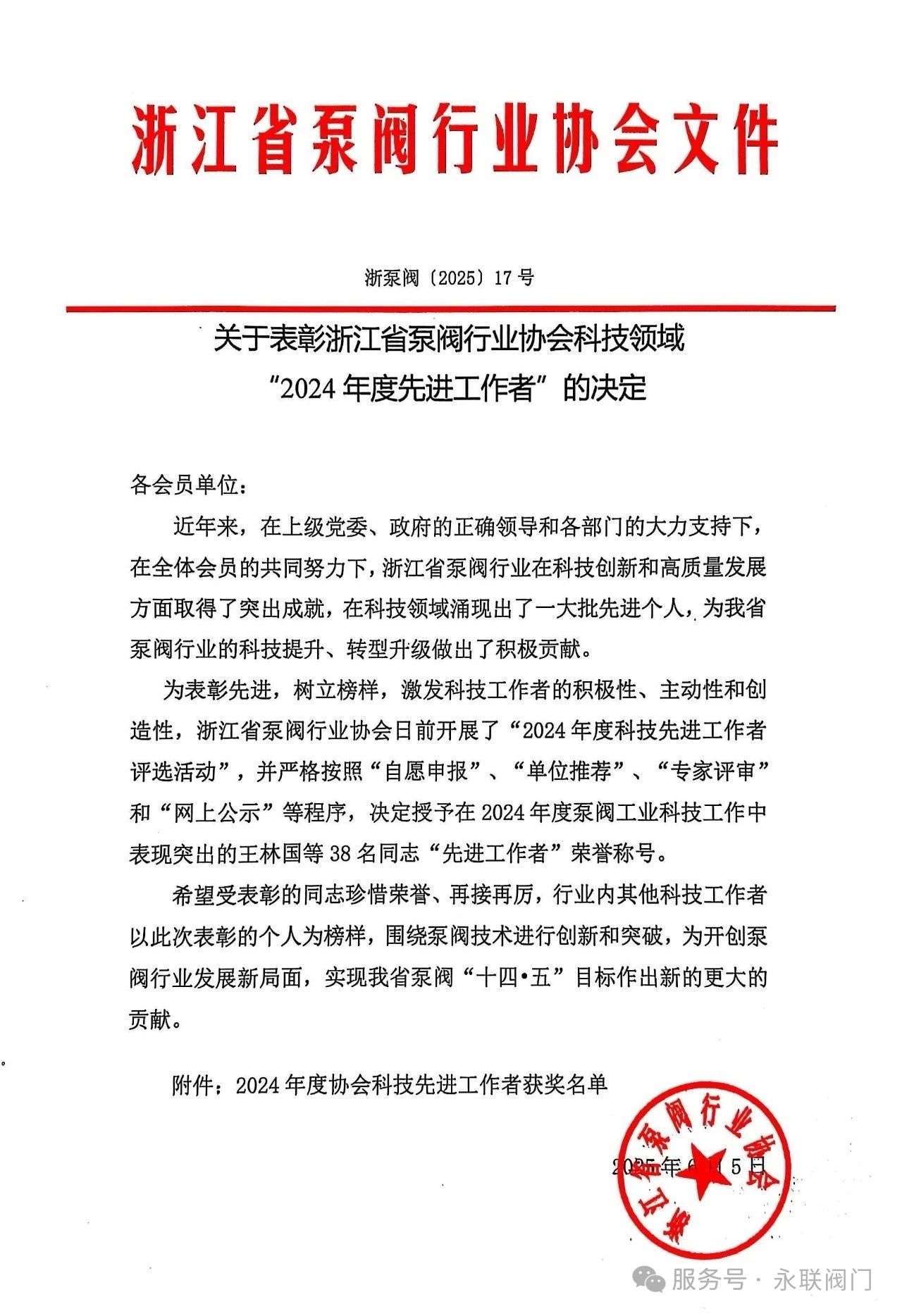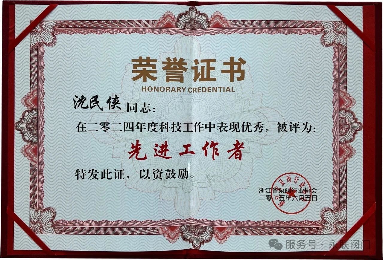 為表彰先進,樹立榜樣,激發(fā)科技工作者的積極性、主動性和創(chuàng)造性,浙江省泵閥行業(yè)協(xié)會日前開展了“2024年度科技先進工作者評選活動”,浙江永聯(lián)閥門集團總經(jīng)理沈民俠榮獲浙江省泵閥協(xié)會優(yōu)秀“先進工作者”榮譽稱號。