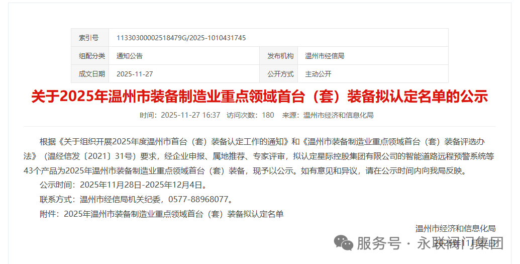 此次榜單的發布,既是對浙江永聯閥門集團創新成就的高度認可,也為溫州制造業轉型升級注入強勁動力。未來,隨著該款核心產品的推廣應用,浙江永聯閥門集團將持續引領特種閥門領域的技術升級,助力溫州制造向高端化、智能化、綠色化目標穩步邁進,為區域制造業高質量發展貢獻更多“永聯力量”。